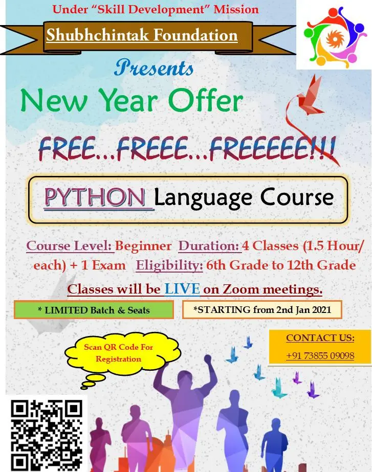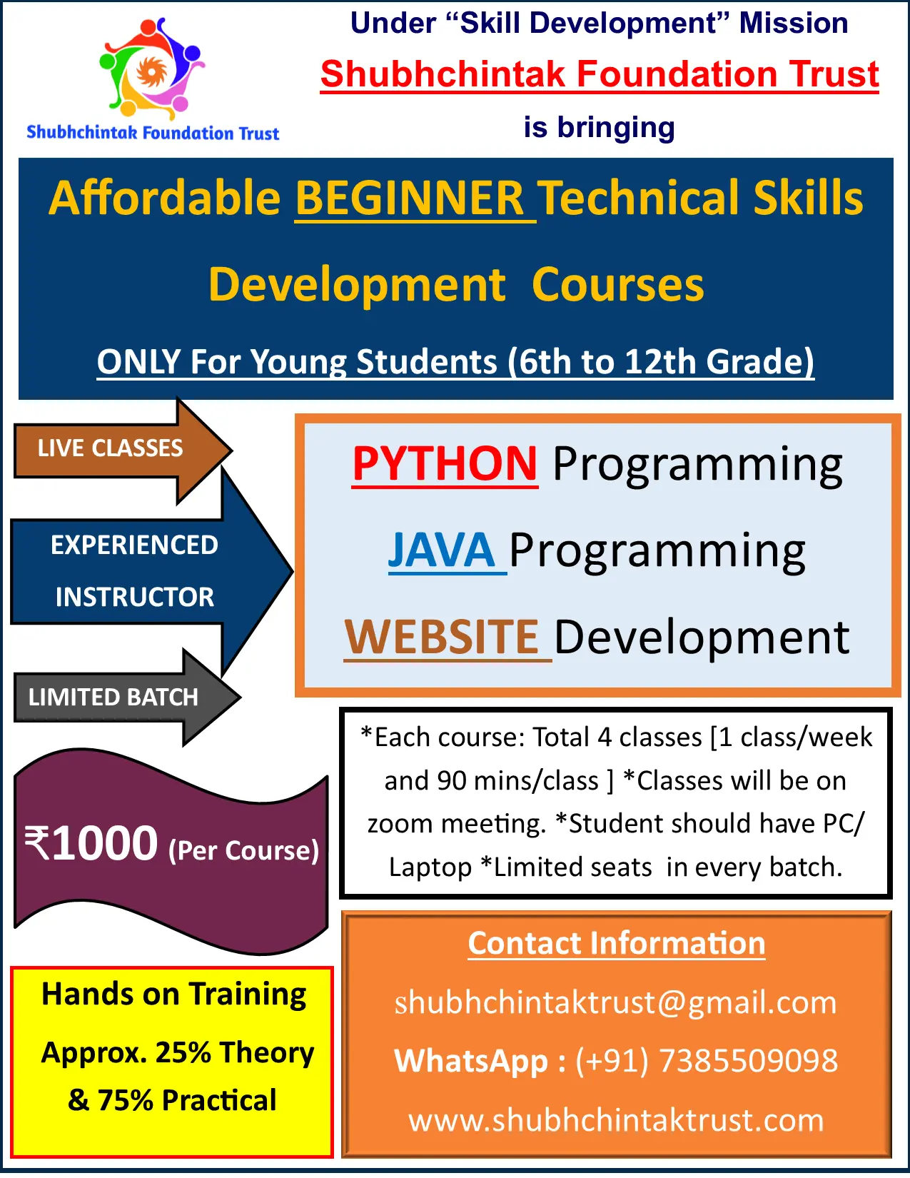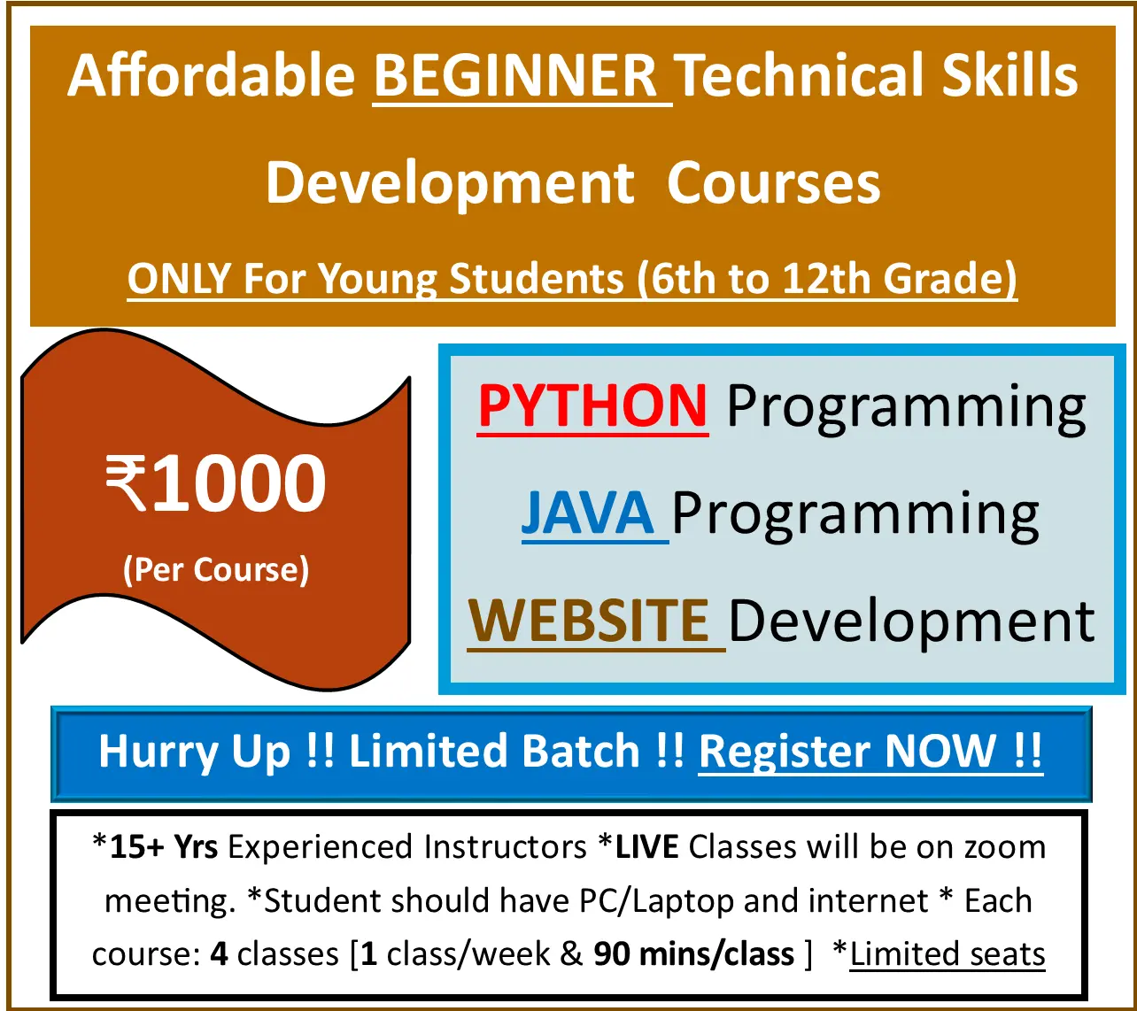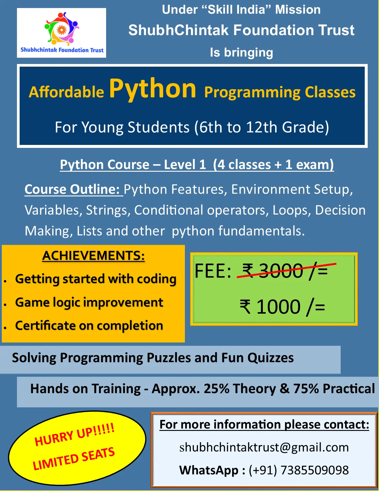 Python programming > Affordable python programming courses > cost : 1000/- > For young students from 6th to 12th grade > courses - Python features - Environment setup - Other python fundamentals > For further details check the poster. For more information mail us at the contact section.