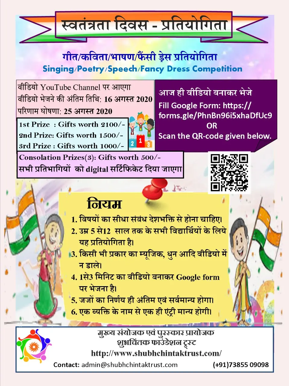Independence day contest > Fill google forms/scan the QR code given in the picture above - Video submission : 16th august 2020 - Result : 25th august 2020 > First prize : worth 2100/- Second prize : worth 1500/- Third prize : worth 1000/- Consolation prize : worth 500/- > Digital certificate to partcipents. For more information mail us at the contact section.